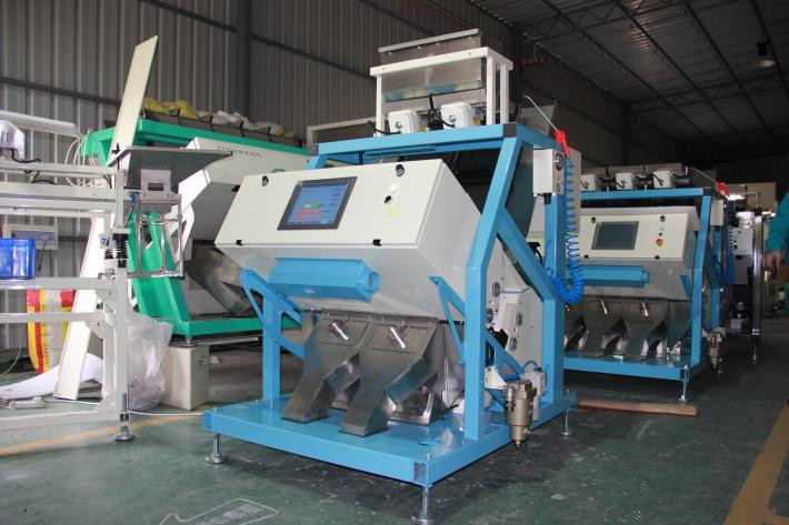 色選機又稱光電色選機,是集光、電、氣、機于一體的高科技產(chǎn)品。是利用光電原理從大量散裝產(chǎn)品中將顏色不正常的或感受病蟲害的個體(球、塊或顆粒)以及外來夾雜物檢出并分離的單元操作,色選所使用的設(shè)備即為色選機。在不合格產(chǎn)品與合格產(chǎn)品因粒度十分接近而無法使用篩選設(shè)備分離或密度基本相同無法使用比重分選設(shè)備分離時,色選機能進(jìn)行有效地分離,其獨特作用十分明顯,是分離密度基本相同、精度完全相同物料的佳設(shè)備。處裝有高穩(wěn)定光源,當(dāng)物料經(jīng)由振動喂料系統(tǒng)均勻地通過斜槽通道進(jìn)入選別區(qū)域時,光電傳感器測得反射光和投射的光量,并與基準(zhǔn)色板反射光量比較,將其差值信號放大處理,當(dāng)信號大于預(yù)定值時,驅(qū)動噴射系統(tǒng)用壓縮空氣吹出異色粒子,從而達(dá)到色選的目的。